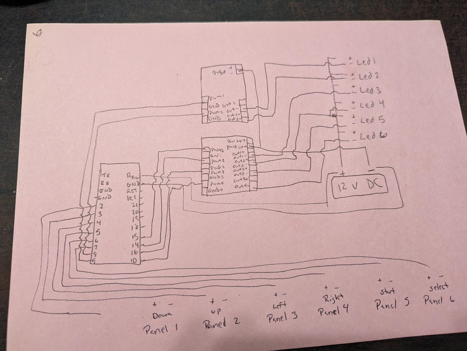I will try to explain what I have going on and some pictures, I will also add the code too. So the dance pad is like what you would find in an arcade with the addition of the top left and right panels for start and select. I have built the thing from scratch and 3d printed the parts that I needed, the intent is that when you step on the pad the controller sends a signal to the computer it is plugged into to show the pad was pressed. I also want the pad to light up when it detects a press. I have color coded the wires to correspond with each pad. After thinking about it I believe that I have the ground not set up properly because I tied in the sensor ground and the light ground to the same ground line. I was also mistaken at the mosfet, ignore all the black wires coming out of them because I was just getting frustrated at that point. I know the electricity from the DC 12v power source is reaching the Arduino and if i take the + and - from the DC straight to the Arduino it turns on but when I try to run the ground it will not turn on, for the Arduino micro pro that is shown in the picture, I have the 12v running to RAW, a ground line ran to the ground pin. then the down panel to 2, up to 3, left to 4, right to 5, start to 6, and select to 7. I have tied the sensor lines to these (might be a mistake) Then I have pins 8, 9, 10, 16, 14, and 15 all going to the Mosfet PWM ports (I think I need to run the ground pins back to the Arduino here instead of back to the DC power source but at the moment they are tied into the common ground) The sensor pad lines are not connected to the other Arduino micro pro yet because I hadn't gotten to that step because I was struggling with this at the moment.