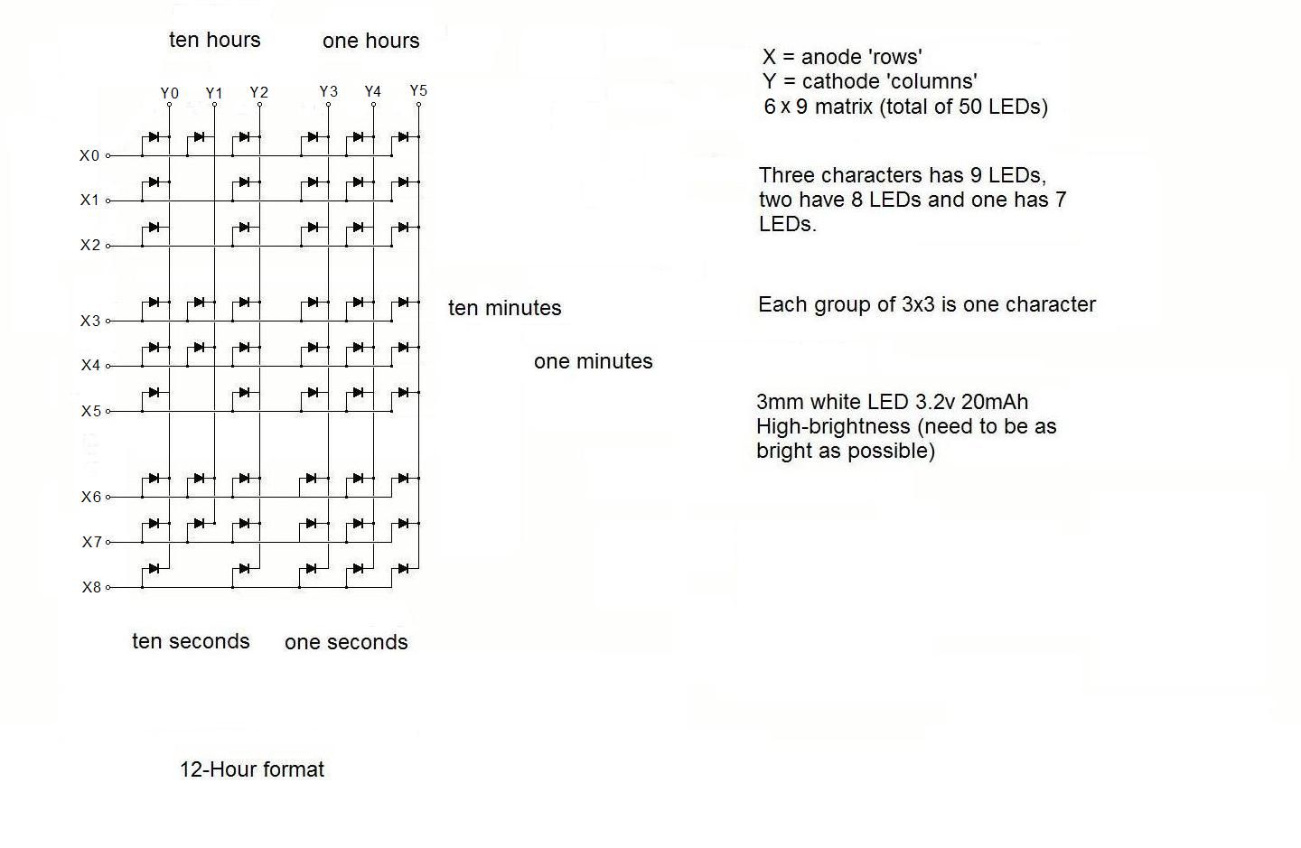 The clock I am building uses a array of LEDs 3 x 18 (3 LEDs per column and 18 per row). The columns are cathode and the rows are anode. The LEDs are 3mm white, 3.2V and 20 mAh. I have the array built, but need help with hooking it up to a Nano. Is it possible to use the pins on the Nano, or will I need shift registers? Which type is best for this project, and what other components would I need?