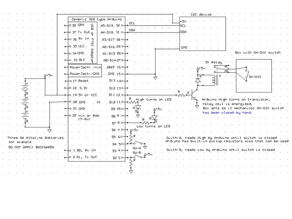 Here are some example hookups you can make. Note that SDA & SCL are supported by hardware in the ATMega chip, they must be connected there.