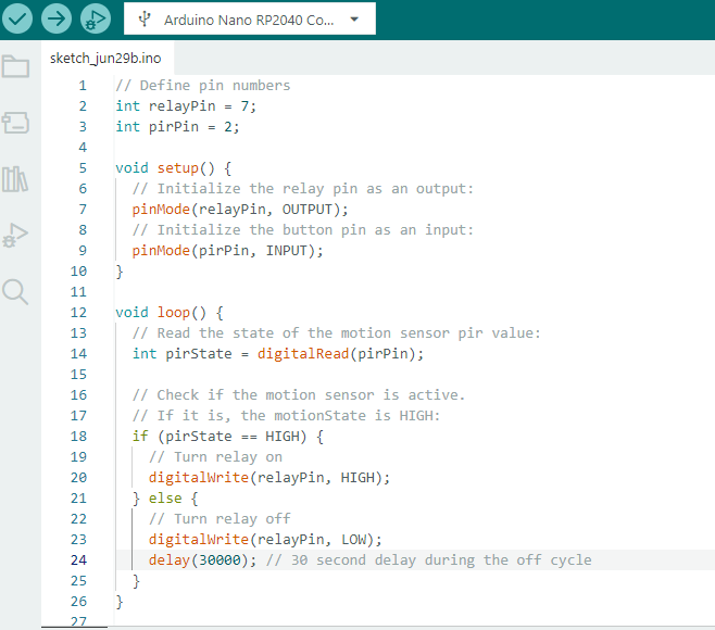After I got "upload" under control I loaded Blink first, and then loaded my project sketch which is pretty straight forward. Arduino see the signal from a PIR motion sensor and fires a relay module. Initially I ran it without any delay to verify it would fire the relay, which it did, then I added a 30 second delay, which was the original plan to eliminate too many cycles. The relay closure turns on a BLI thunder and Lighting device. At any rate, the relay closure still works but seems to fire randomly instead of when the motion is detected after 30 seconds. I'm guessing there is something wrong in my code.