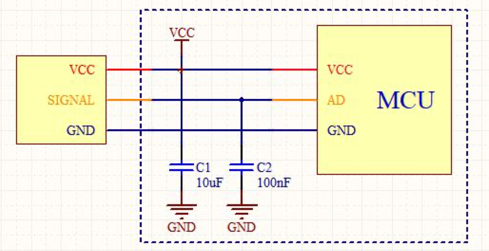 Le condensateur sur Vcc serait pour stabiliser l'alimentation sans doute et celui sur la ligne de signal permet d'effacer la composante alternative et stabiliser le signal - un anti rebond.