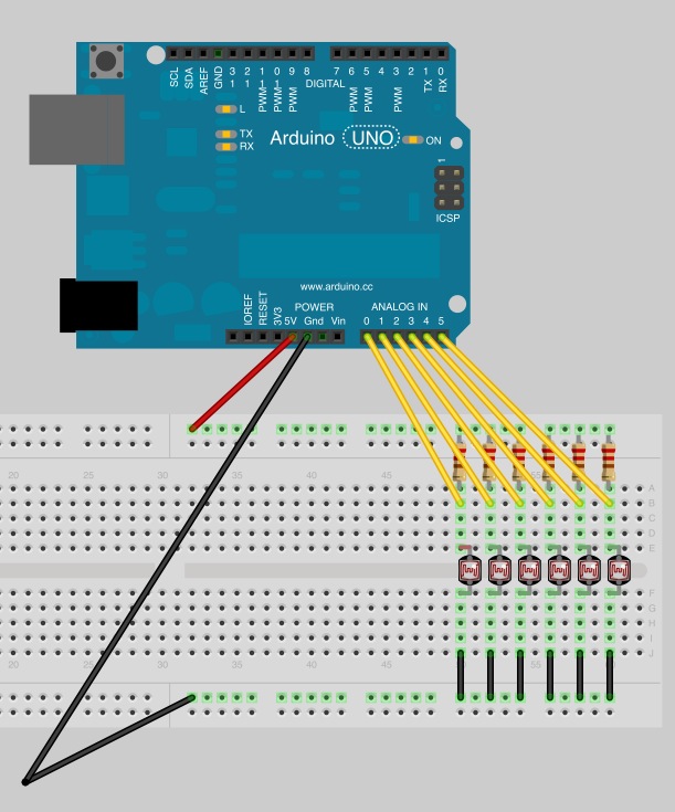 Basically, I wouldn't like to change a software mapping every time the installation is in another room with differenent brightness (or light coming from a projector) and thought that if it is possible to swap the 6 resistors to 1 pot I then could adjust the resistance and have an easier life. Is this possible?