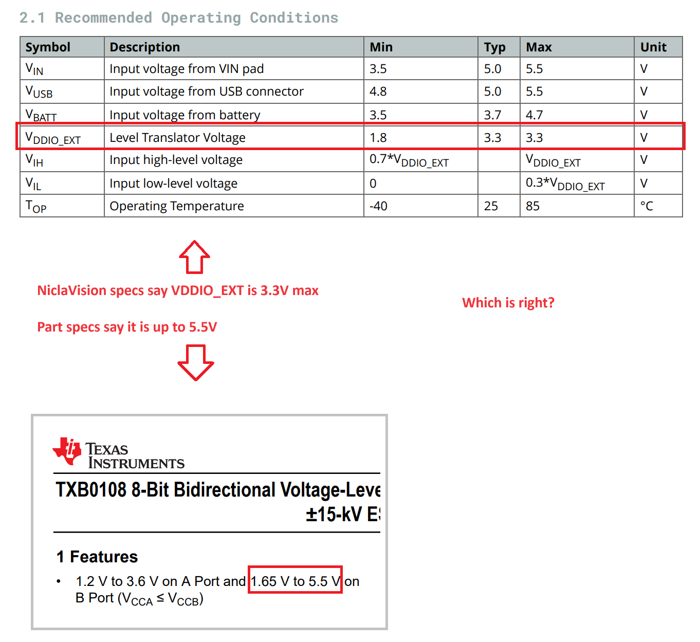 Also a bit confusing that specs say VDDIO_EXT max voltage is 3.3V, while TexasInstruments say in its specs that it is 5.5V. Which one is correct? Can I supply more than 3.3V on VDDIO_EXT?