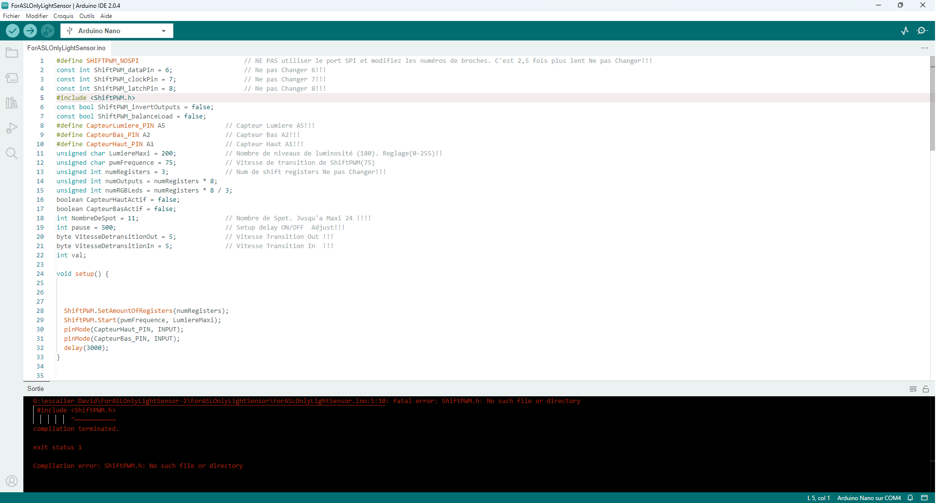 Mon problème est que mon papa est malheureusement décédé avant de finir et c'est lui qui avait fait le programme dans l'arduino Nano . J'ai retrouvé son draft mais quand je veux le téléverser dans la Nano il marque compilation erreur et surligne en rouge la ligne qui fait défaut. Mais moi quand on bricolait avec mon papa j'étais plus les mains et lui la tête du coup je n'y comprends pas grand chose malgré mes recherches. Du coup je me permets de solliciter votre aide, je vous ai mis le Screenshot de l'erreur, si quelqu'un pouvait m'aider à résoudre ce problème cela serai magnifique car cela me tient à cœur de finir le travail.
