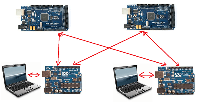 La idea es que cada uno de los dispositivos lleve un arduino mega con capacidad para adquirir diversos datos del exterior. Y dependiendo de los valores medidos el arduino mega se comunicara con uno de los arduinos conectados al pc.
