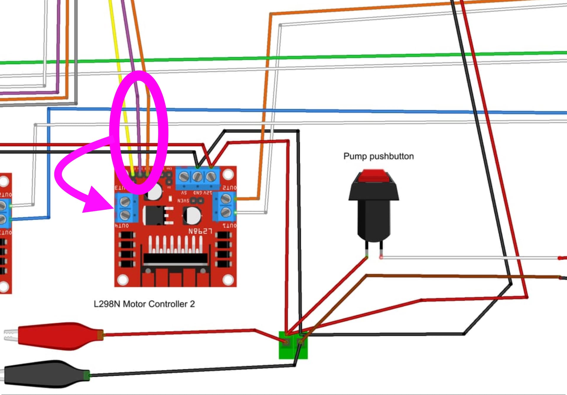3) Power the pump through the spare channel on the L298n, controlling it with the switch through the Enable pin. Still messes the display and hangs up the Arduino when the button is pressed.