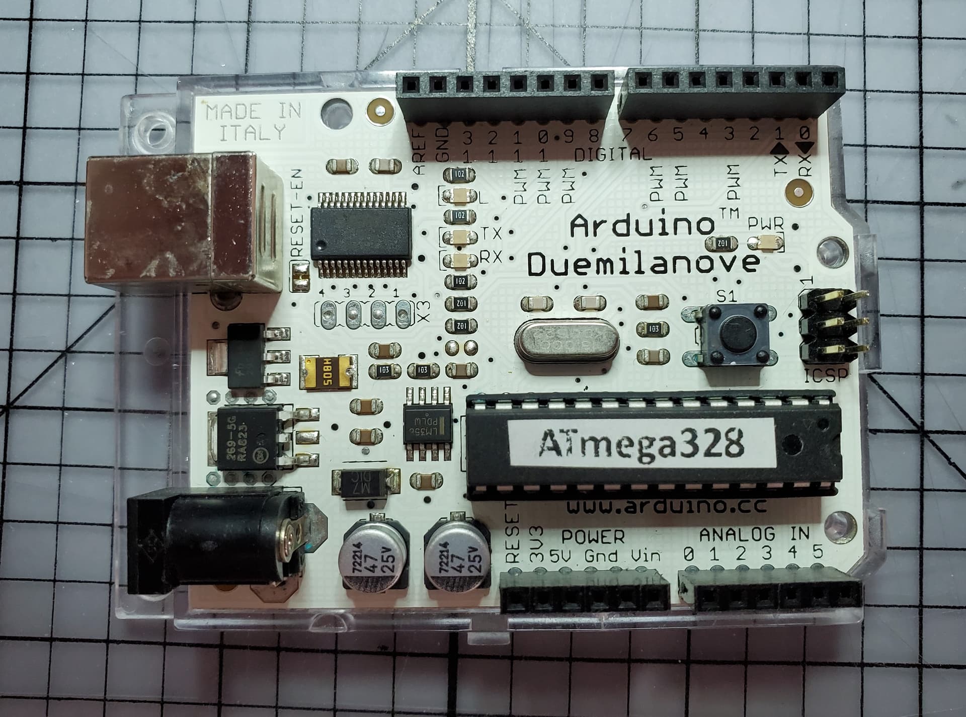 Yet another eBay find... this Arduino Duemilanove came stock with a ATMEGA328 and an Italian flag "bubble" decal. Other than that, there is no other information on this unit.