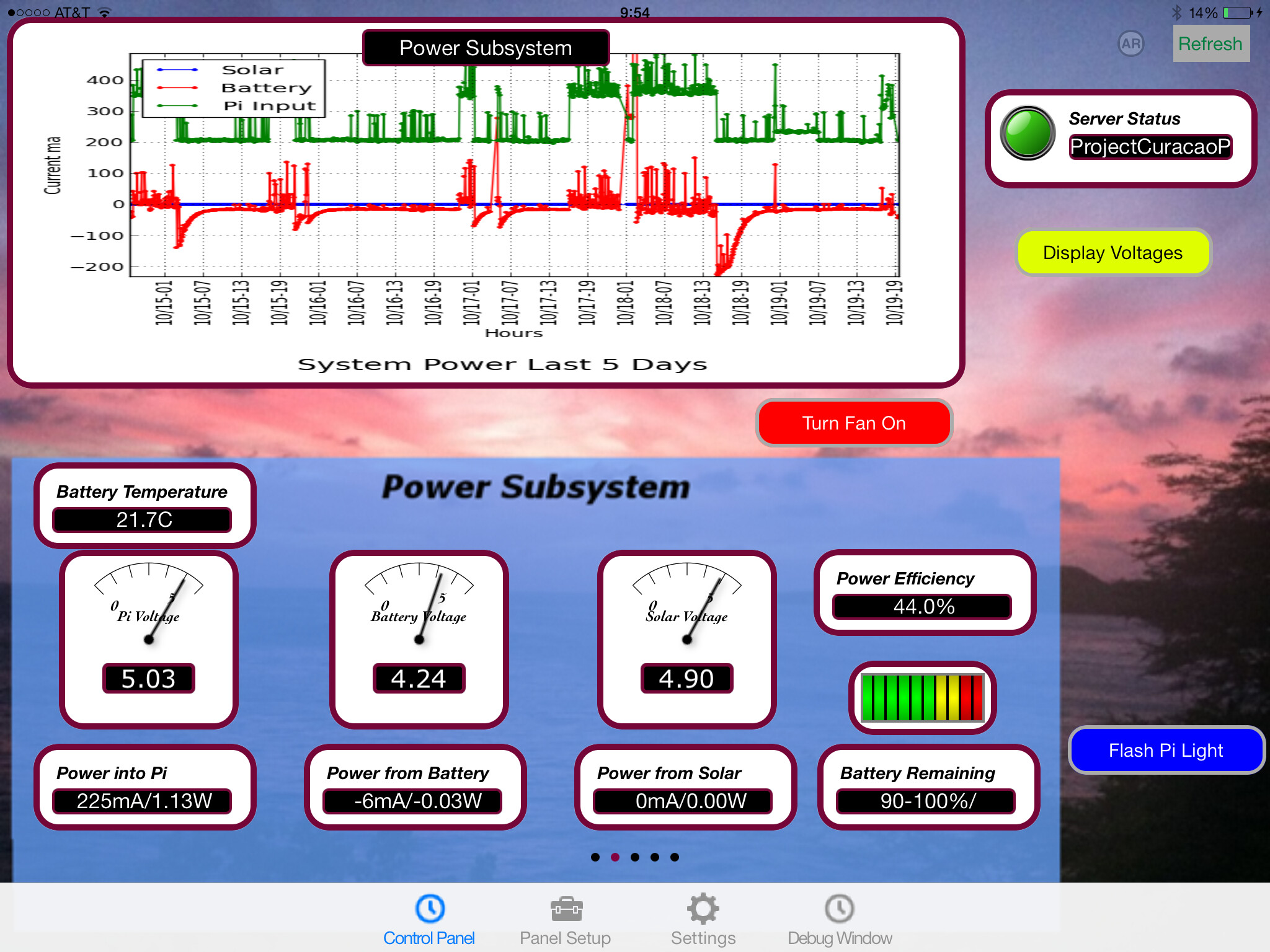 Note that while I am reading the currents from INA219s connected to the Arduino I2C bus, I put the data in a MySQL database on a Raspberry Pi to crunch the data and build the graph using matplotlib in python. So in the picture below from my iPad, the graph is connected up to a Raspberry Pi and the meters and buttons are connected to the Arduino directly (across the internet of course). ArduinoConnect allows me to mix end computer devices on the same page.