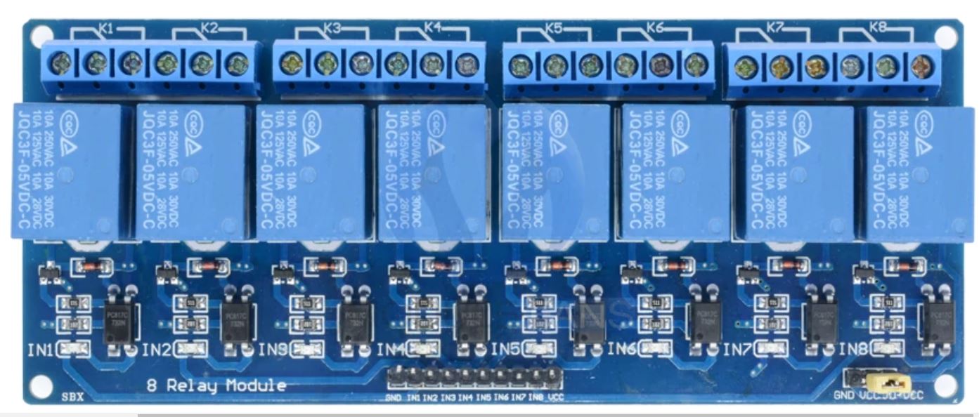 The status of each individual relay (here in the schema just a simple NO switch) is read via Pin D7