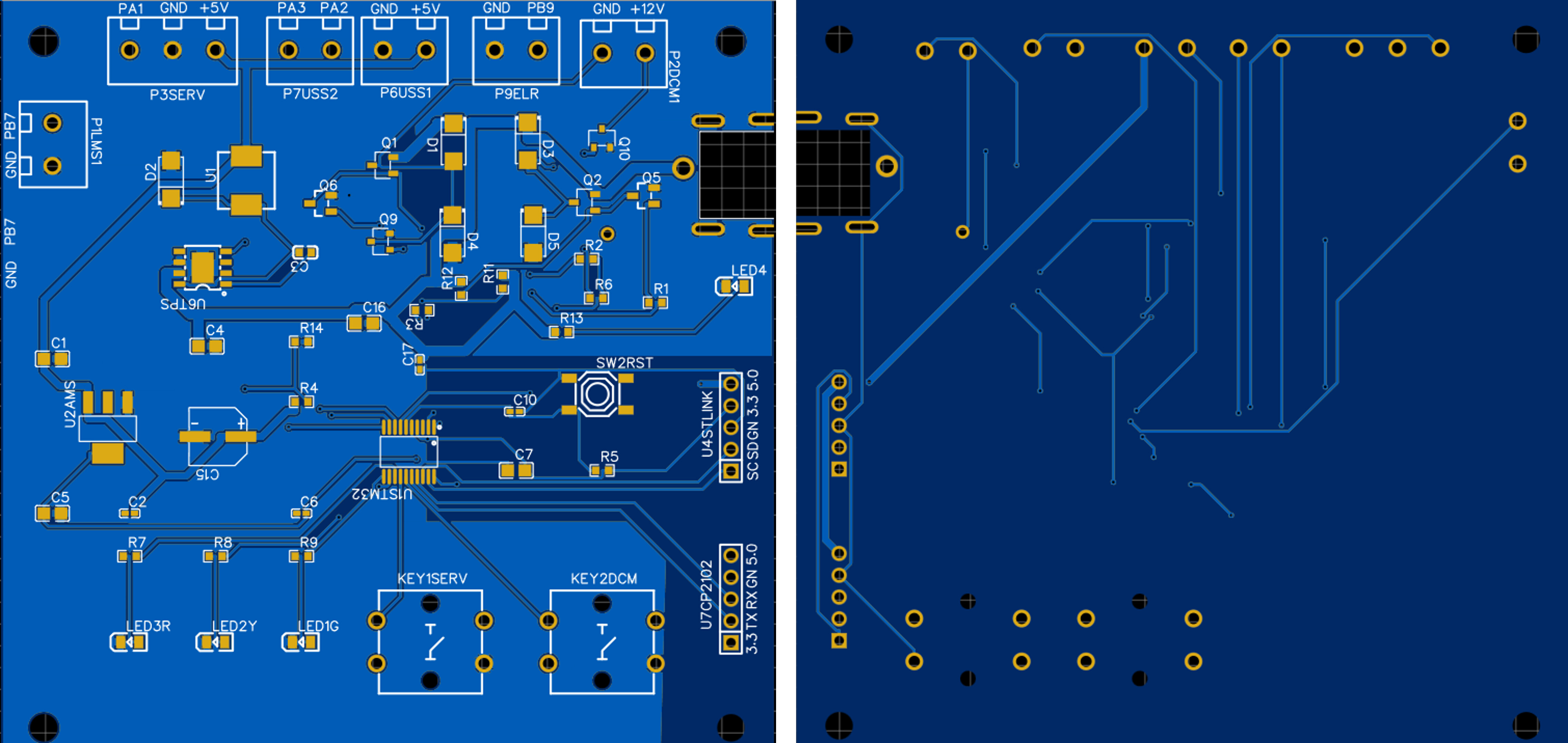 I'm designing my first fully functioning PCB and would greatly appreciate your help reviewing my PCB layout. This board is based on the STM32 microcontroller and includes buttons, LEDs, motor drivers and so on as you can see. I'm hoping to catch any potential issues before moving to production, as this is an important step for me, and thank you so much for your feedback in advance!!