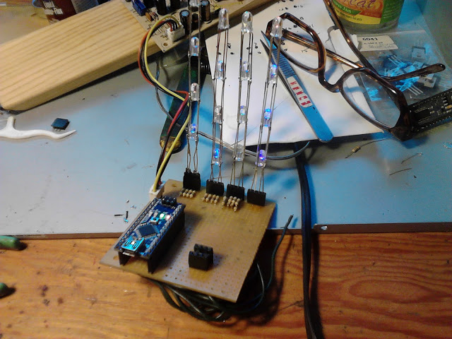 I've modified one of my charliecubes to use 100 ohm resistors, and it is noticably dimmer, Im going to try to measure some LEDs with a few different resistors sizes and calc the current use, and try to get them closer to 20ma. Nearest I can tell, I will have to settle for less current on the blue/green, If I drop to 50 ohm, that should put the blue/green at about 20ma, but the red should be over 20ma. Because of the layout, you can only use one size resistor and keeping red within spec means putting blue and green considerably lower current than red.