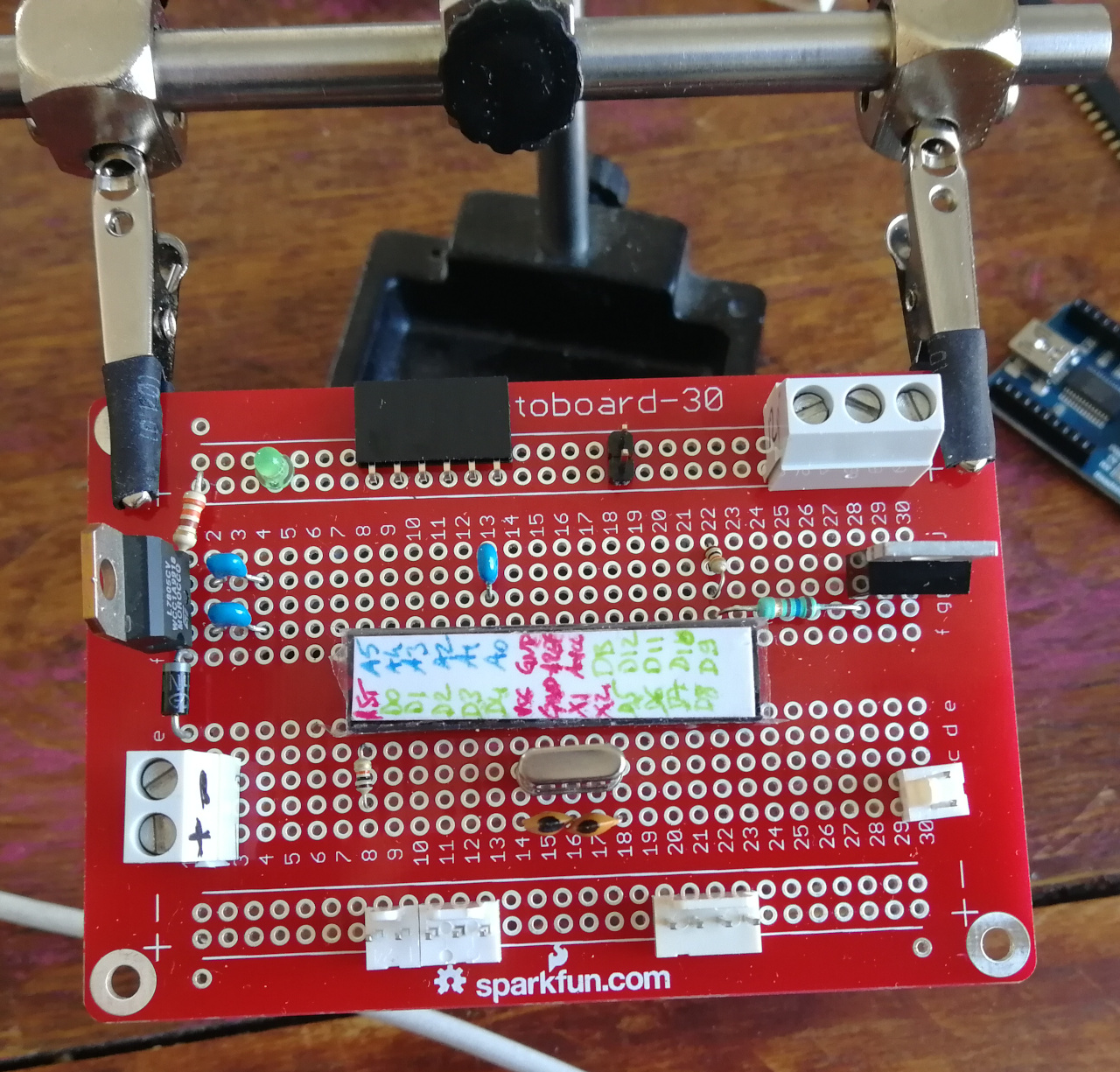 J'ai intégré la partie puissance sur la carte avec un ATMega328 et un régulateur 7805 qui me donne le 5V pour la partie logique.