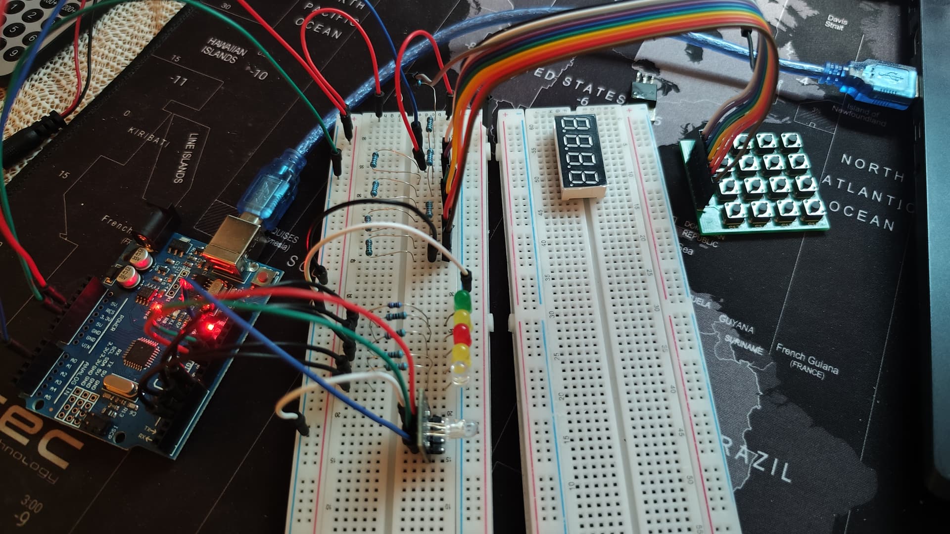 it suposes to be a semaphor simulator, where on keypad 4x4 one of 32 signals is selected (first series directly by single press, than second one, by double or long click). Semaphor consists of 5 LED plus addtional RGB led. Keypad is read by only one cable (using bynch of resistors). Serial prints might be used to display signal code on 4 disgit 7 segment display, or LED display