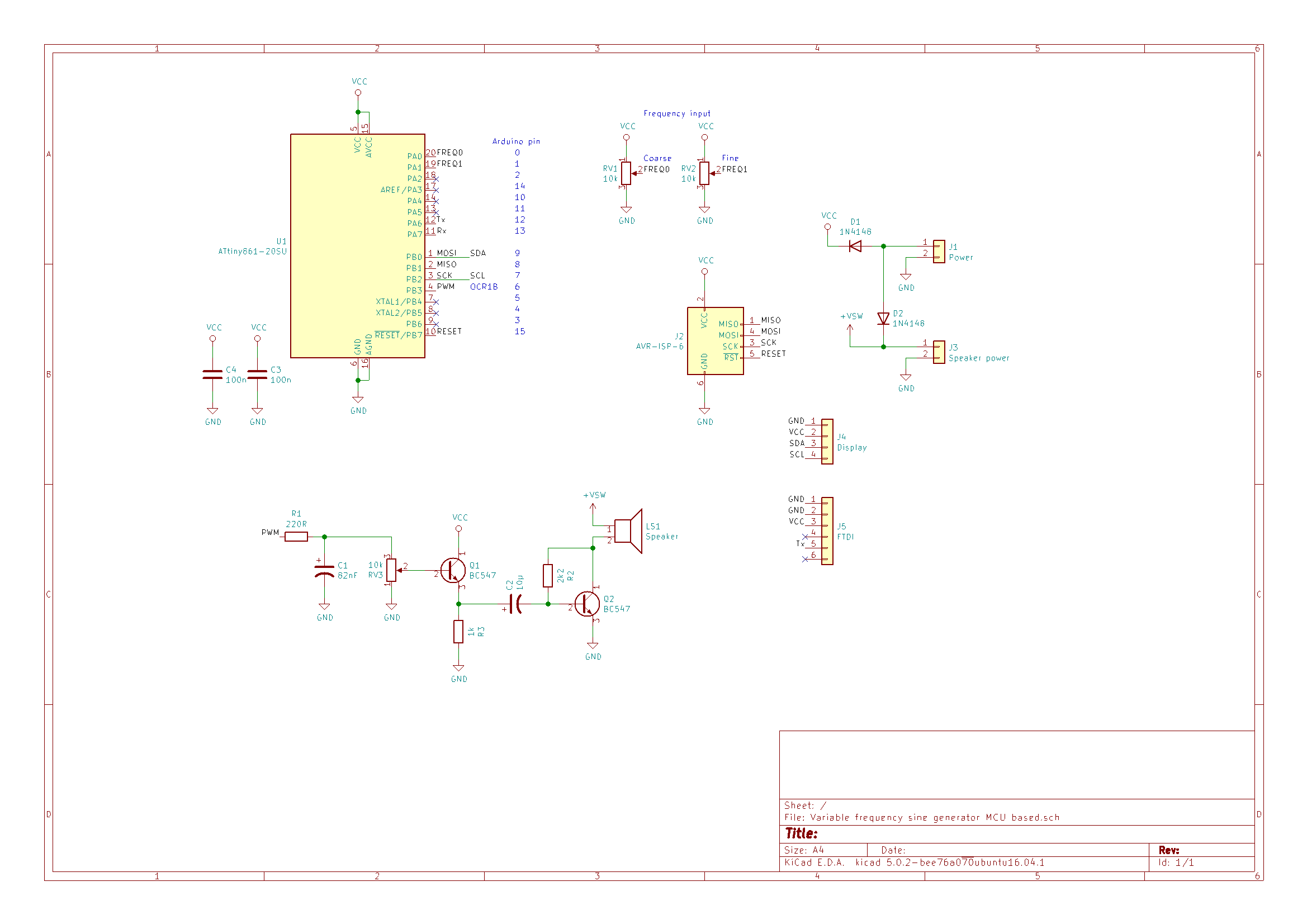 Also note this method is specific for the ATtiny861a, which has a 8-bit 64 MHz timer for 250 kHz PWM frequency, allowing a rather decent sine wave at frequencies as high as 18 kHz, all the while keeping R1 and C1 small. I used a film cap for C1, as it's a kind of timing cap, ceramic should work as well.