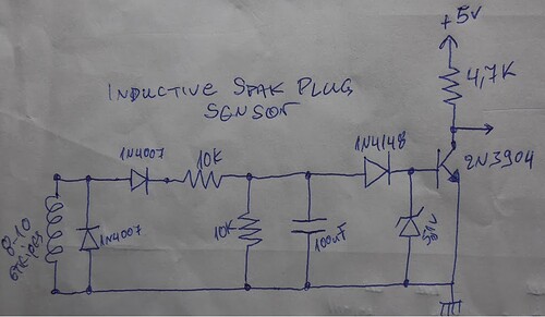 I recently came across a very cool blog post where someone used a spark plug to find RPM by wrapping the spark plug wire a few times and then taking resulting inductive current to drive transistor, which then pulses a Schmit Trigger, and then goes to Pin 2 on Arduino.