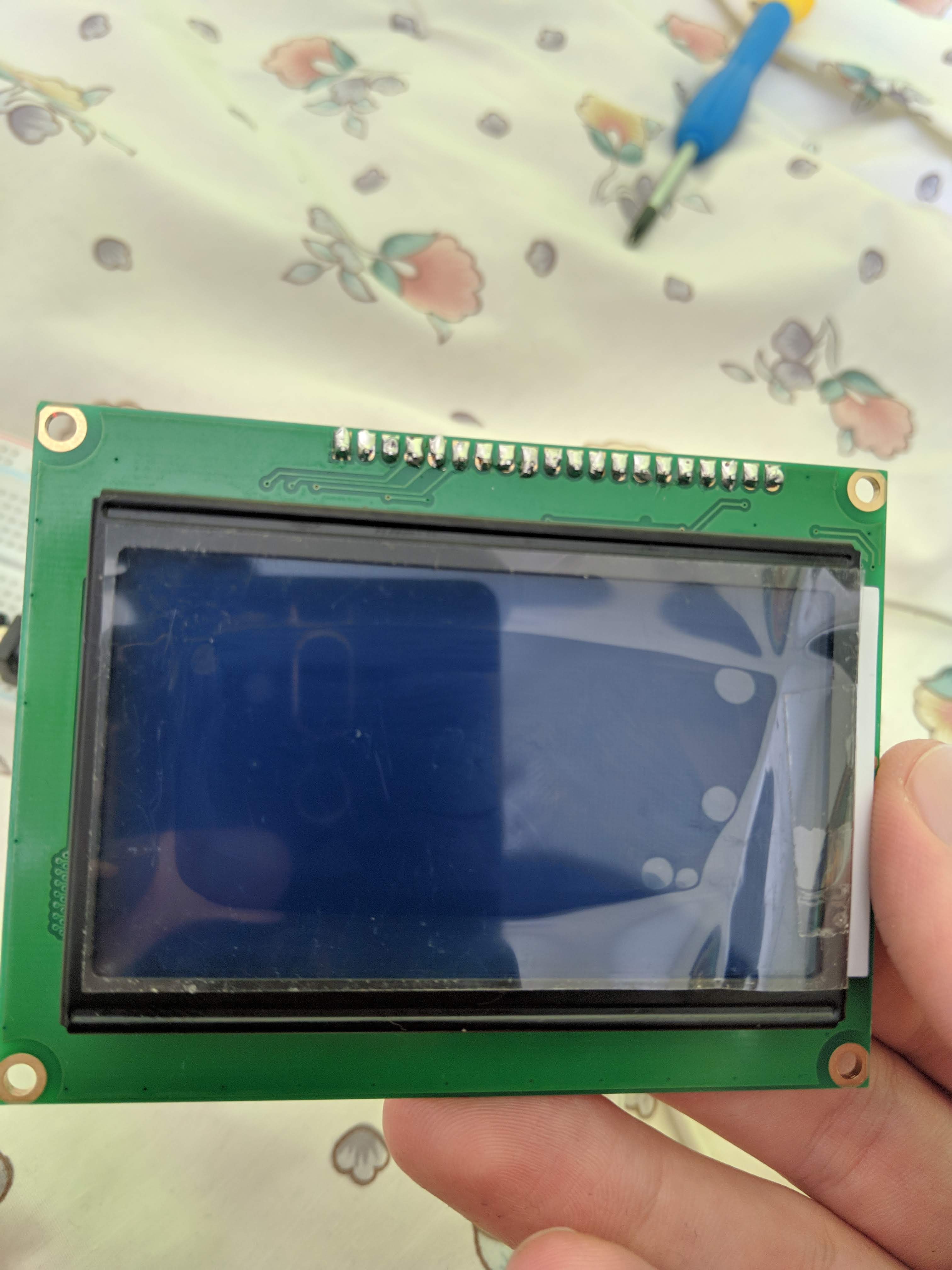 So the problem is I hook up everything, put any example sketch on the Arduino (have tried multiple), but nothing appears on the screen. As you can see on the pin image, there's a built-in potmeter to set the contrast on the screen. When I use that potmeter, the background color of the screen changes, as you can see on the next two images, but nothing else happens.