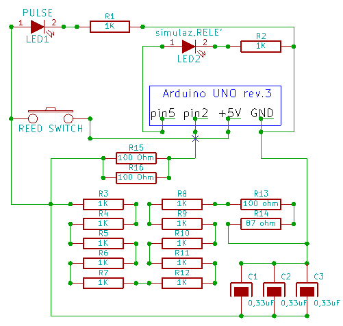 Ho realizzato un banalissimo circuito di prova composto da un sensore reed, un magnete sulla pala di una ventola 12v azionata da un'alimentatore, un led (con resistore da 1KOhm) che simula il relè e un'altro led che segnala la chiusura del reed ad ogni giro della ventola (che poi sarà l'albero cardanico)