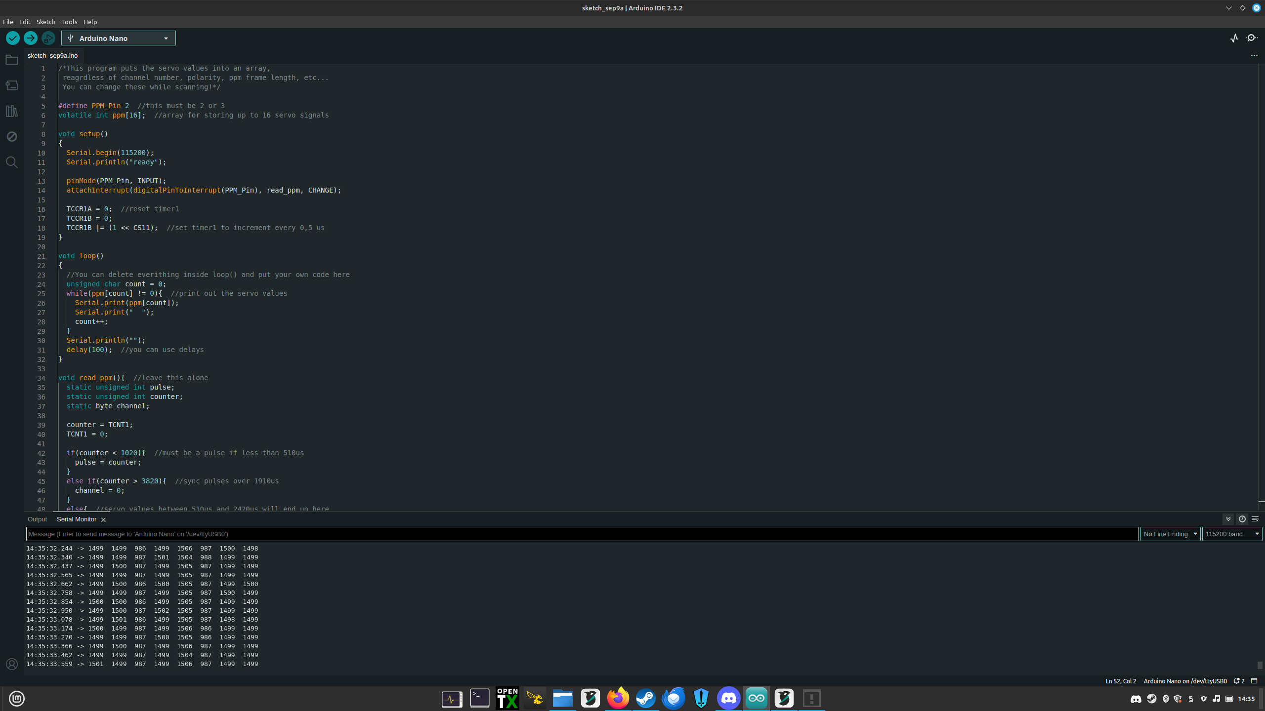 I can get ppm values written up on the serial plotter however... They are all over the place. 1 or 2 channels can be made out but if I hit a toggle switch for example, everything is all over the place.