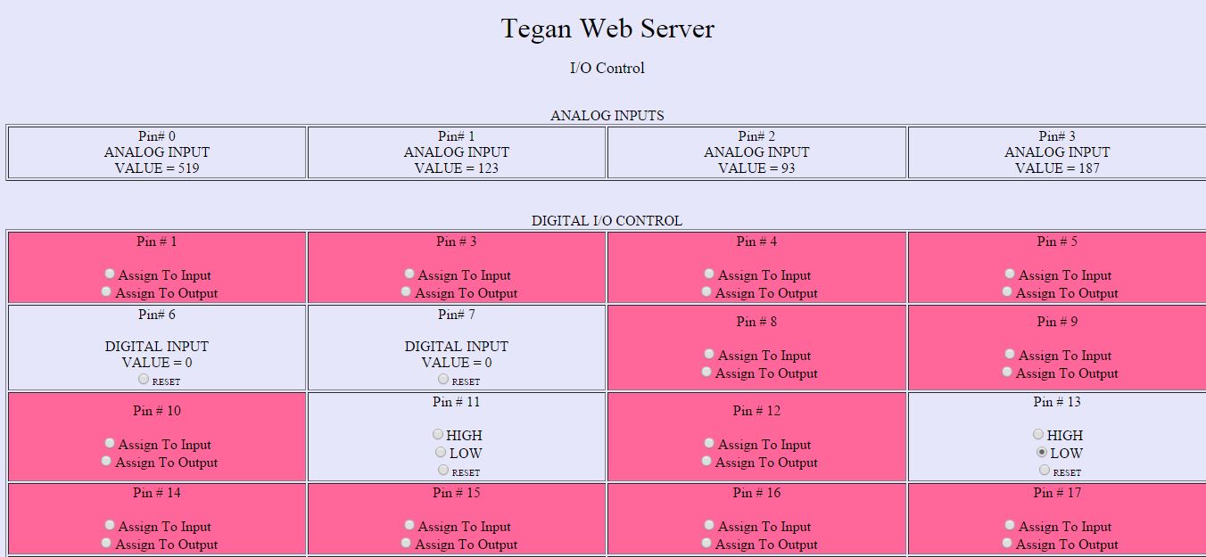 TeganWS provides an I/O Control page which displays the Analog Input readings and has radio buttons for configuring, reading and writing all the digital I/O pins for easy configuration and breadboarding directly from a browser. Uninitialized pins are color-coded for easy identification.