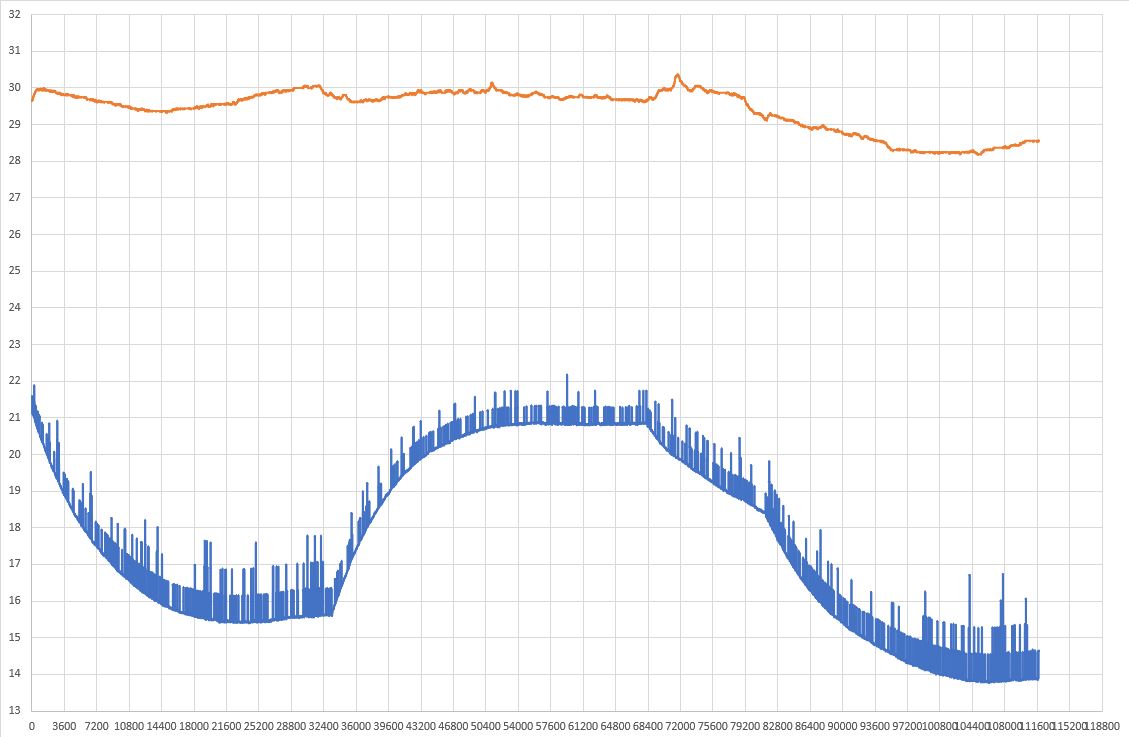 The sensor that measure the inside temp is located very close to the water outflow from the Peltiers heatsink. The value jumps for some unknown reason that I have to investigate. The red line is the ambient temperature. First step is done on a stable system by switching on the lights over the box (it is illuminated and the lamps heat it for some extent) plus lowering the peltier current from 2.248A to 1.284A. Second step is increasing the current from 1.284A to 1.776A with lights still turned on. For the third step I didn't have time to wait for stabilization, it consists of further increasing the current from 1.776 to 2.259A and turning off the lights. The horizontal axis lines are on every hour. From this picture it cannot be seen, but the deadtime is small, it is hard to measured it, because in the moment I'm regulating the current by turning a potentiometer, so it takes some time and the step is not really rectangular, but I can say it is under 30 seconds. The measurements are taken every second, this is the minimum period that the sensor allows.