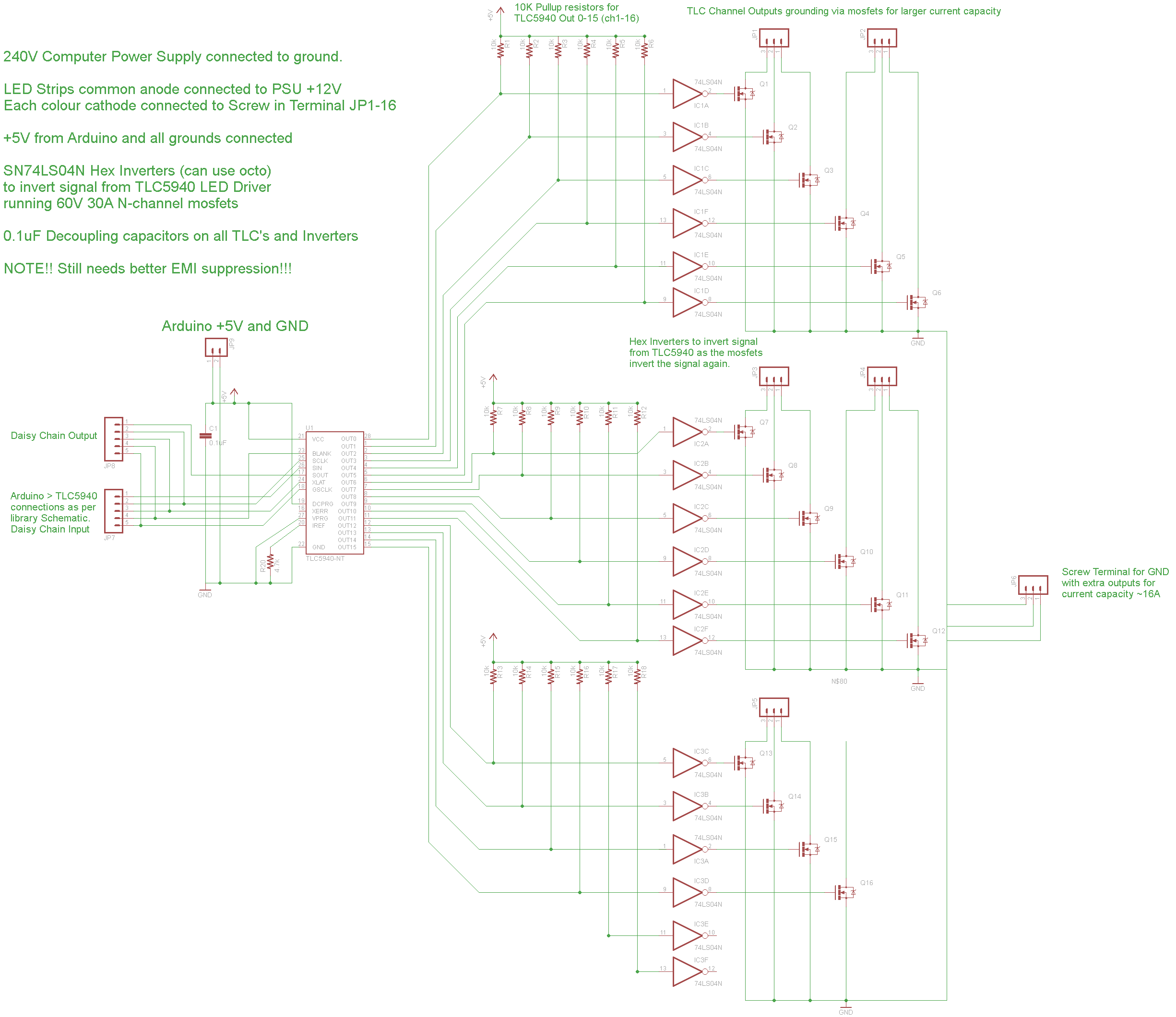 Hi, I am making a xmas New Years light controller with an arduino Uno + TLC5940 + hex inverters (for the mosfets) + N channel mosfets. It works nearly perfectly however if I turn off and on a fluoro light somewhere on the same 240v power circuit as the power supply and arduino the TLC goes very very hot n fails.