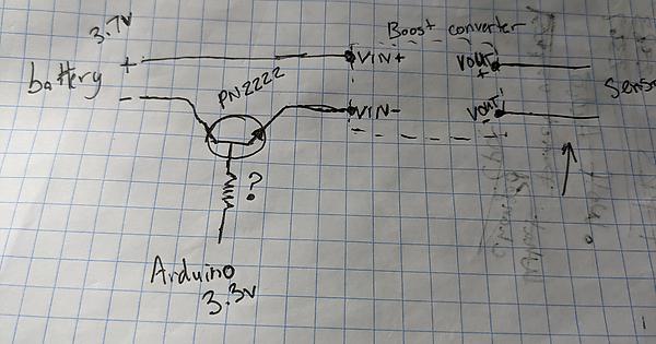 I'd like some help with the transistor needed to be able to switch the booster on and off so that it is only running when I need to take a sample. I should only need power for about 1 second. (As well as any advice if this is an okay way to do this??)