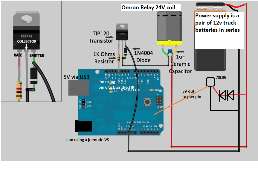 I'm powering the Jeenode with a 78L05...I put a pair of diodes between the 24V supply and the input pin just to give a bit of voltage drop from the 24 volts (although it is rated to 35 volts). Measure 4.9 volts out to the jeenode.