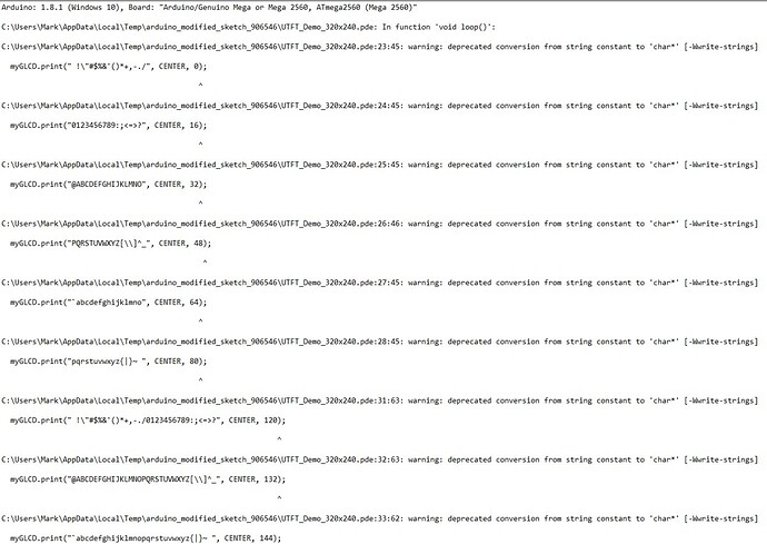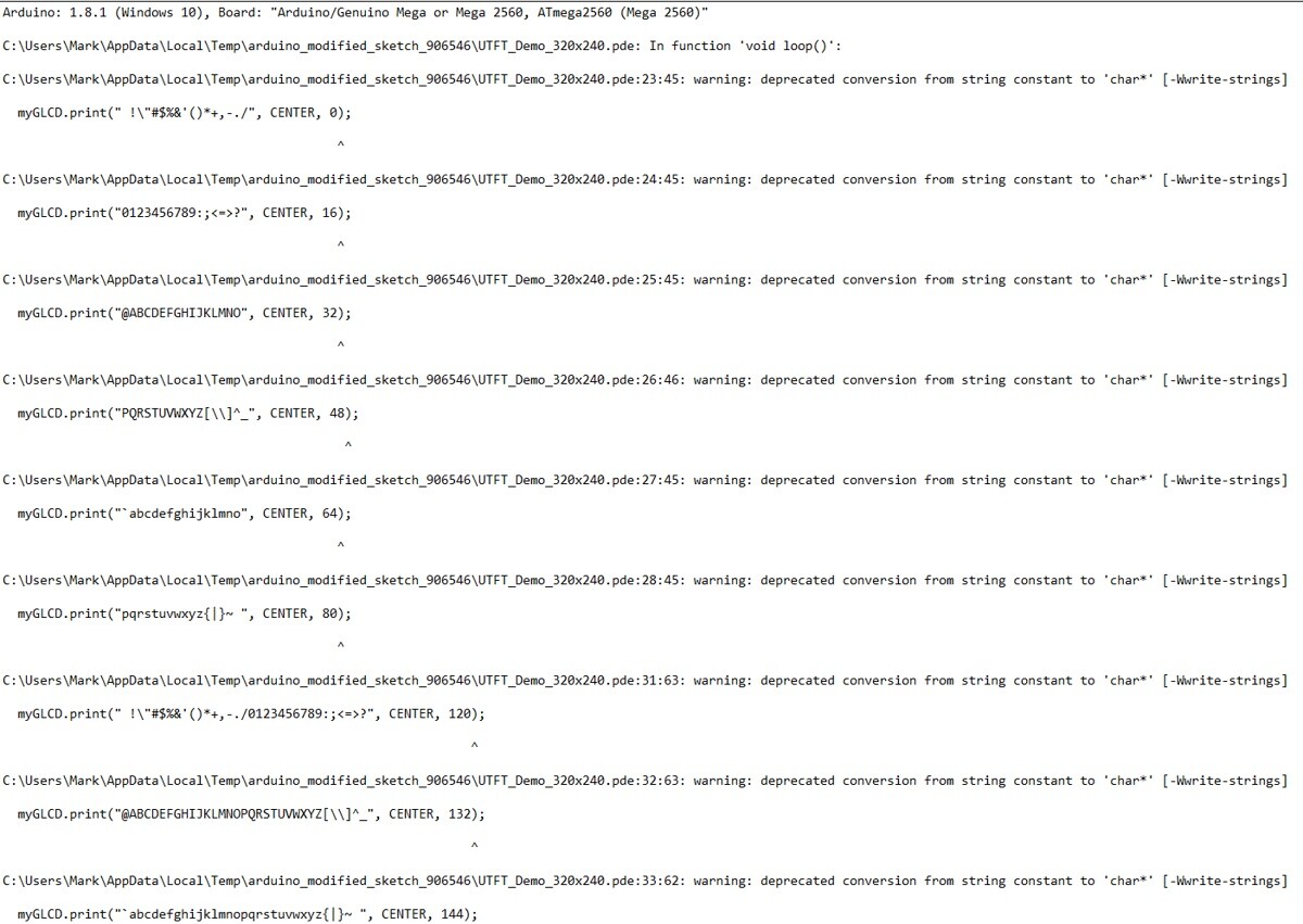 I managed to get the UTFT example working for 320x240 displays yesterday even that is no longer working for some reason. Then I have tried to write my own program+bits and pieces i found online just to see if the display is showing all the characters correctly. But it fails to verify and I have no clue why.