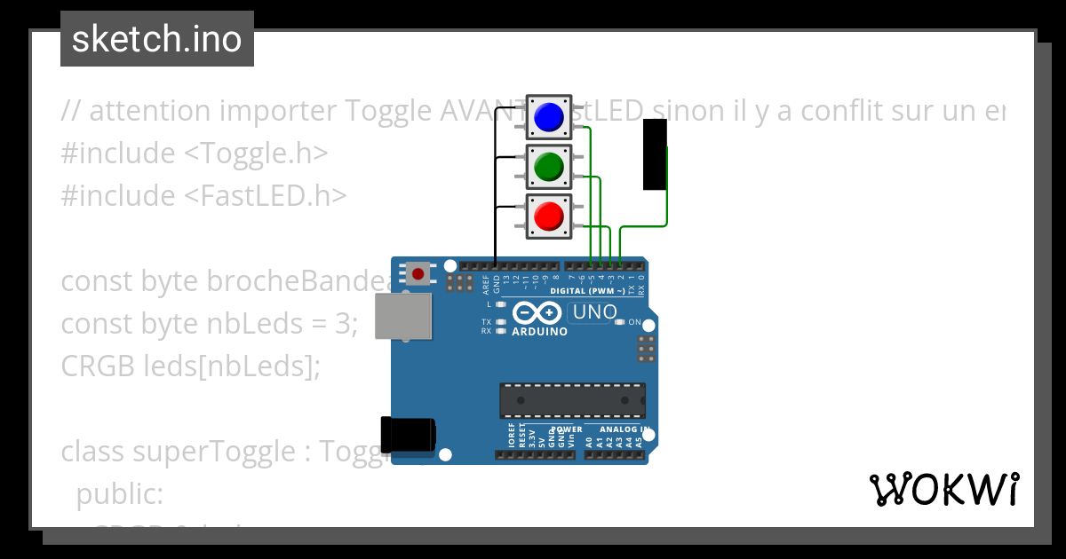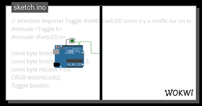 Je souhaitai utiliser Toggle pour approfondir mes connaissances sur cette bibliothèque, mais malheureusement il y a une incompatibilité entre celle-ci et FastLED, utilisée pour contrôler les leds RGB. Je suis donc passé à OneButton (qui présente l'avantage d'avoir nativement des fonctions pour gérer les différents types de cliques).
