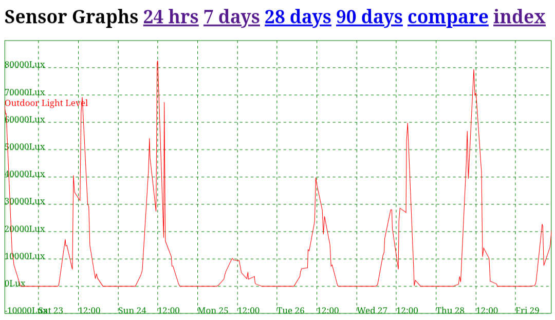 Below you can see my readings over the last week. They peak over 80,000lux. If I compensated for the 1.2 factor, my readings would exceed 100,000 lux, which would not seem correct for northern England in March.