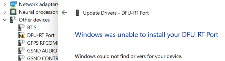 I have also tried installing the DFU-RT_Port_(Interface_2).inf file directly by extracting them, but they also fail with: "A certificate chain processed, but terminated in a root certificate which is not trusted by the trust provider"