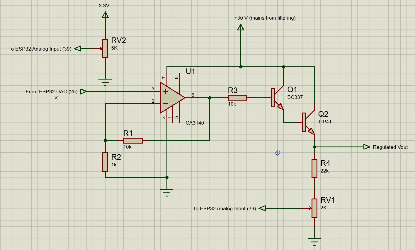To drive the transistors on the regulator section, I'm thinking of using an opamp with the necessary dc gain to multiply my control signal (0 to 3.3 or 5V) to the full range of voltage output, which will be around 24V. The chosen one so far is CA3140, for it may be powered up to 36V.