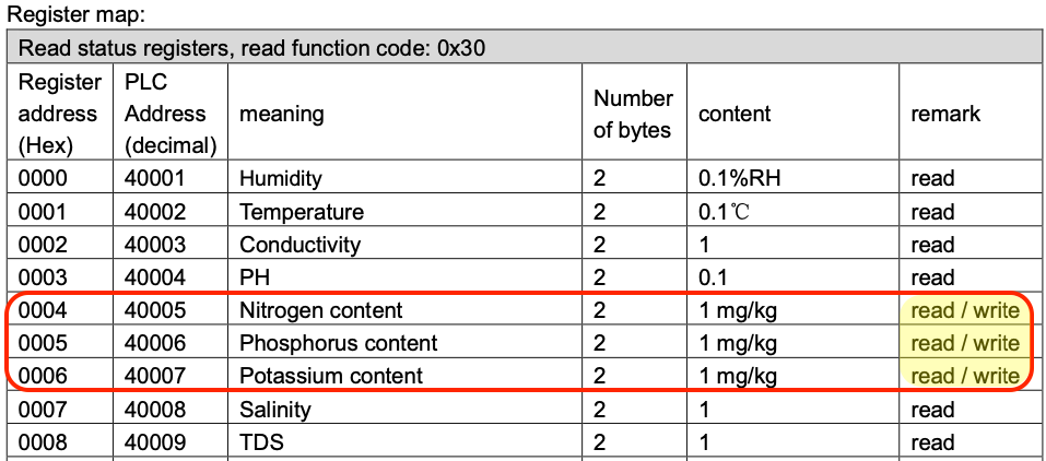 It's not just that. The other strong indication is that the N, P and K registers of the sensor are explicitly listed as read/write, while all others are read only. So the sensor is certainly designed to have NPK values written to.