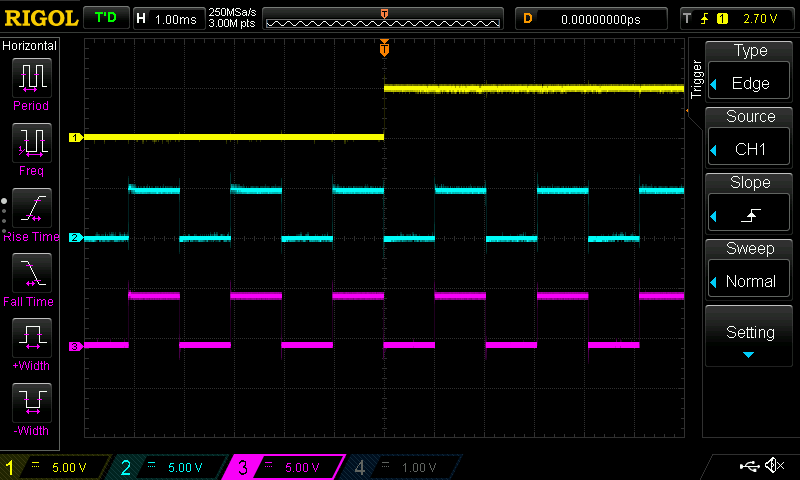 After commenting out sei/cli and adding isrIrqOn, the toggling continues during the time consuming code, and doesn't skip a beat as can be seen in this closeup: